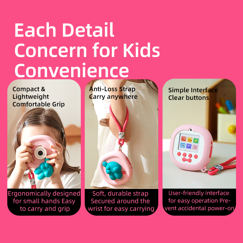 Lekka konstrukcja dobrze leży w małych dłoniach, a kolorowy silikonowy futerał dodaje trwałości i zachęca do zabierania aparatu ze sobą wszędzie. To sprzęt, który pozwala dzieciom zatrzymywać ich własne, codzienne przygody.