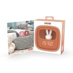 Wykonany z przyjemnej tkaniny i silikonu „soft-touch” zapewniającego miękkość. Przyciski z tyłu pozwalają ustawić: godzinę, datę oraz 3 alarmy, a łatwy w użyciu przycisk dotykowy na budziku pozwala  regulować jasność.
