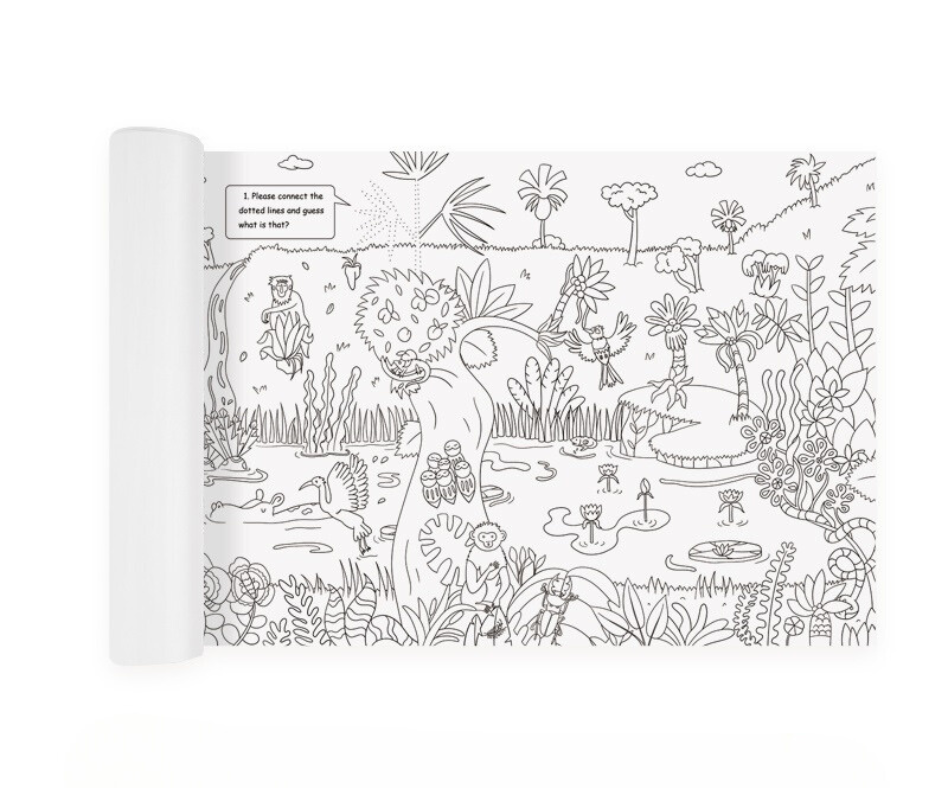 Dłuuuuga kolorowanka na długą zabawę. 10 metrów zróżnicowanej dżungli, która tylko czeka na ubarwienie dowolnymi kolorami. Dzięki sporej powierzchni dziecko może stworzyć wyjątkowo różnorodny krajobraz, przelewając na papier całą swoją kreatywność. Dżungla na pewno nie będzie jednolita! Wspólnie stwórzcie miejsce, które zachwyca niezbadaną dotąd roślinnością i ekscytuje swoją dzikością na każdym kroku.
