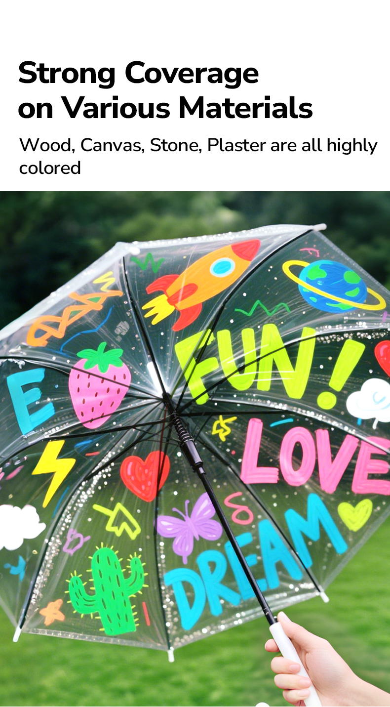 Tusz nakłada się gładko, a intensywne pigmenty dobrze wyglądają na papierze, drewnie czy szkle. To kompaktowy zestaw, który zachęca do eksperymentowania i pozwala testować więcej pomysłów w krótszym czasie.