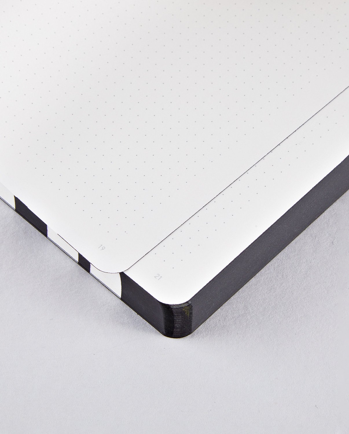• Strony: 256 ponumerowanych stron z siatką szarych kropek o średnicy 3,5mm, dającą swobodę pisania, szkicowania i rysowanie.