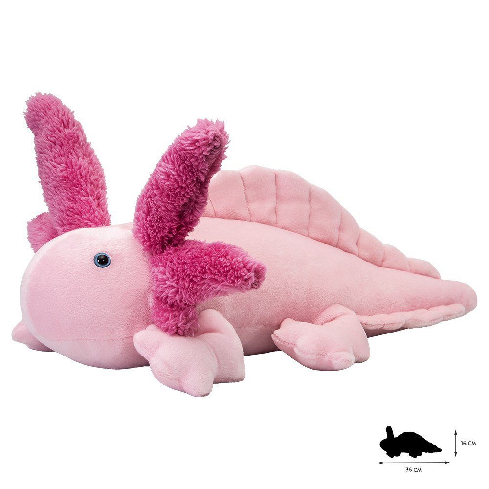 • Ten pluszowy aksolotl ma wymiary: 36cm x 16cm.