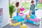 Duży kwadratowy pojemnik w kształcie klasycznego klocka LEGO® w radosny sposób pomaga uporządkować dziecięcy pokój.