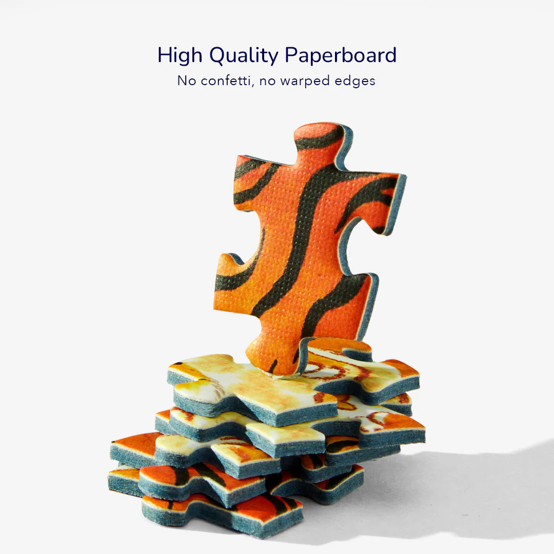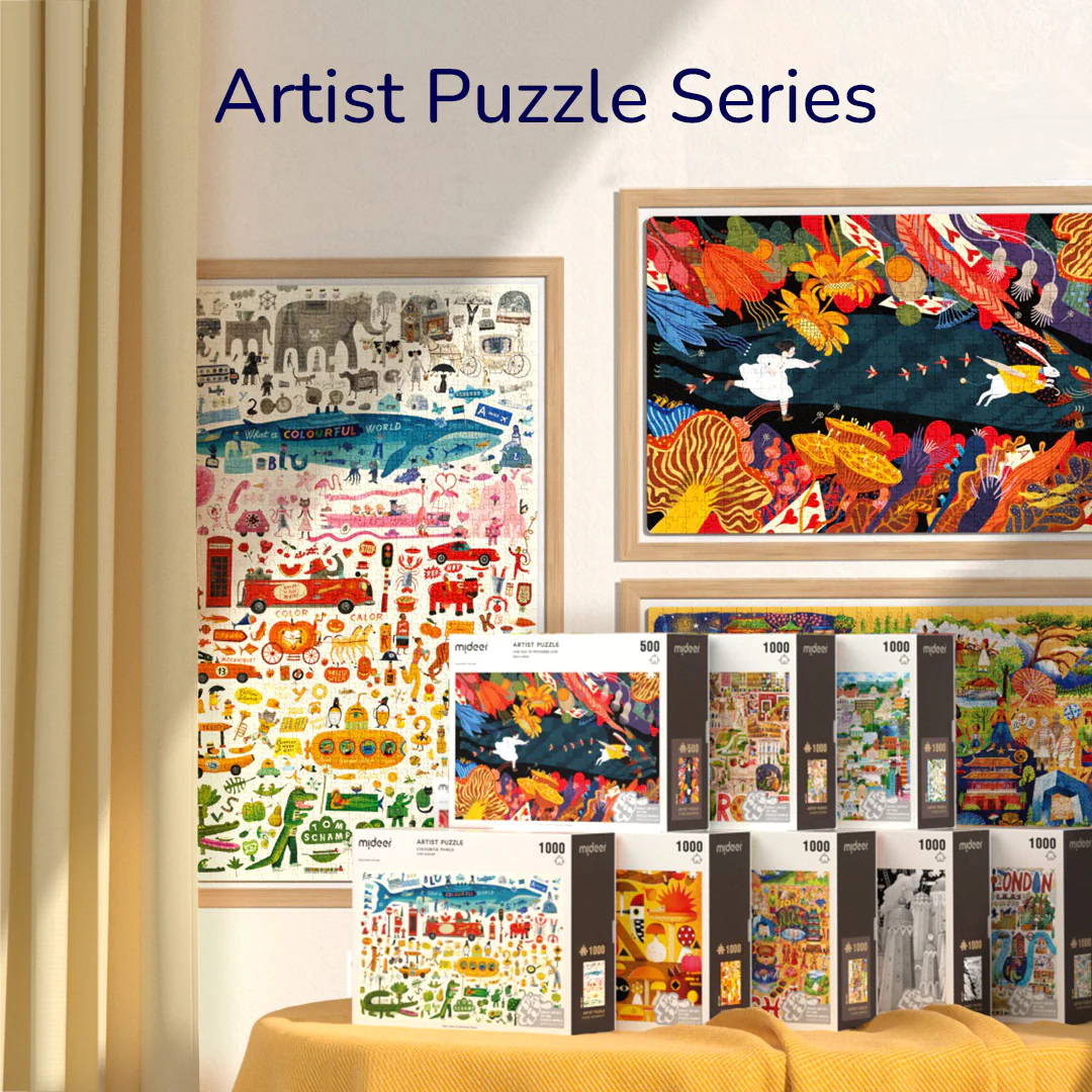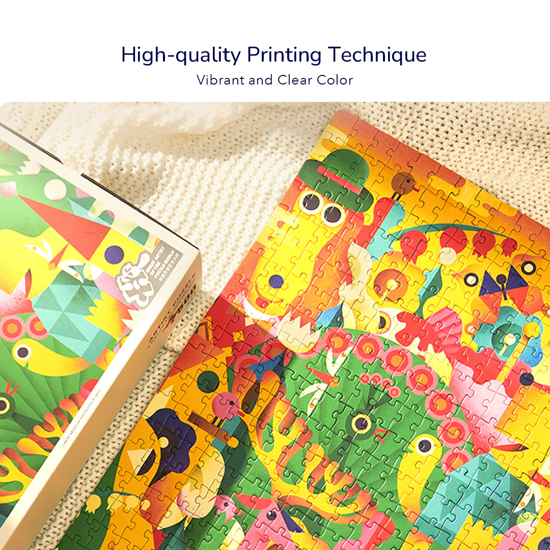 Puzzle artystyczne pokazują, że układanka nie musi przedstawiać motywów z telewizyjnych bajek, aby zainteresować dzieci. W najmłodszych tkwi wrażliwość i niezwykła ciekawość świata, które wręcz pchają je do poznawania nowych opowieści. Bogate i jaskrawe kolory szalonych grafik snują niesamowite historie warte poznania. Spędzając jakościowy czas na tworzeniu z dzieckiem pięknego obrazka Leśnego cudu, możemy nie tylko cieszyć się nawzajem swoją obecnością, ale i uczyć się cierpliwości i bycia tu i teraz. Dzięki uniwersalnym motywom oraz liczbie elementów puzzle uszczęśliwią również dorosłe dzieci. Do zestawu dołączony jest klej, dzięki któremu możemy utrwalić nasze dzieło i powiesić (je na przykład nad dziecięcym biurkiem), oraz przypinka nawiązująca do grafiki.
