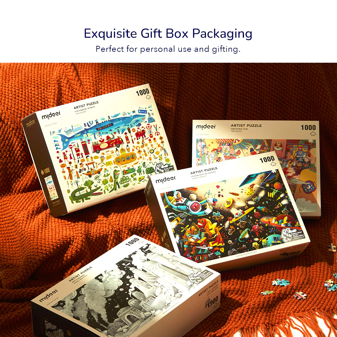 • Zawiera: 1000 puzzli, 1 instrukcję, 1 szpatułkę do nakładania kleju i klej, 1 broszkę