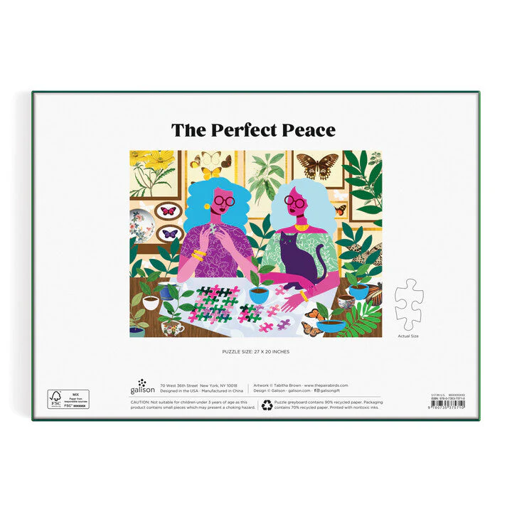 Puzzle Galison The Perfect Peace to kolorowa, optymistyczna scena pełna zieleni, motyli i towarzyskiego spokoju. Wspólne układanie staje się tu symbolem relacji i harmonii, a soczysta paleta barw przenosi nas do świata, w którym codzienność zyskuje wyjątkowy rytm.
