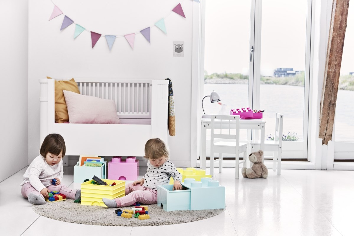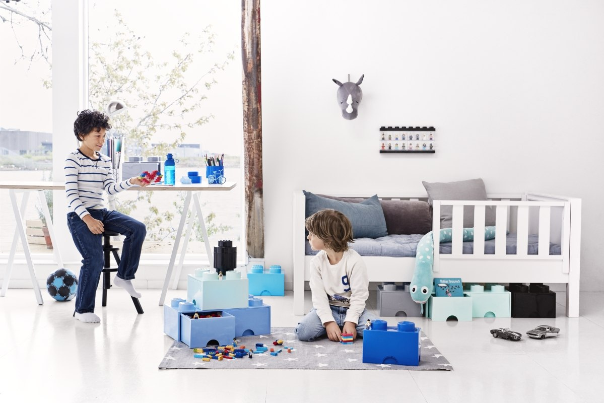 Największy pojemnik z dwoma szufladami w kształcie klasycznego klocka LEGO® w radosny sposób pomaga uporządkować dziecięcy pokój.