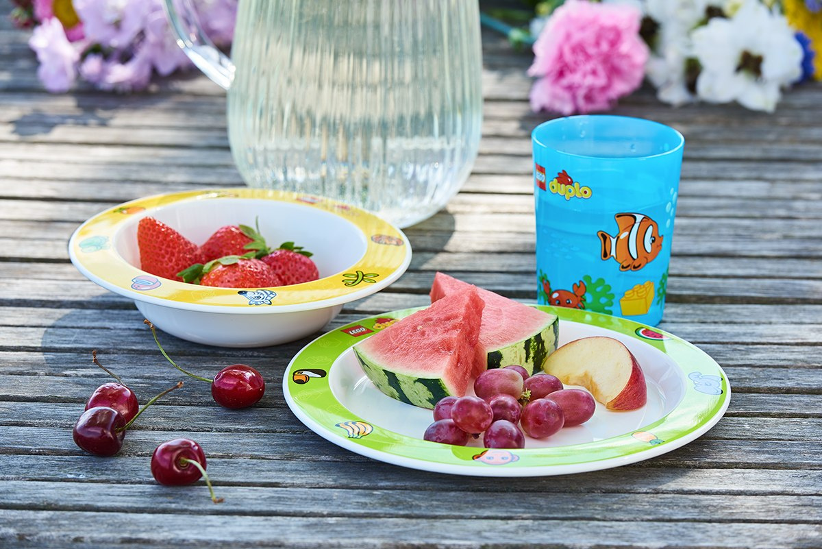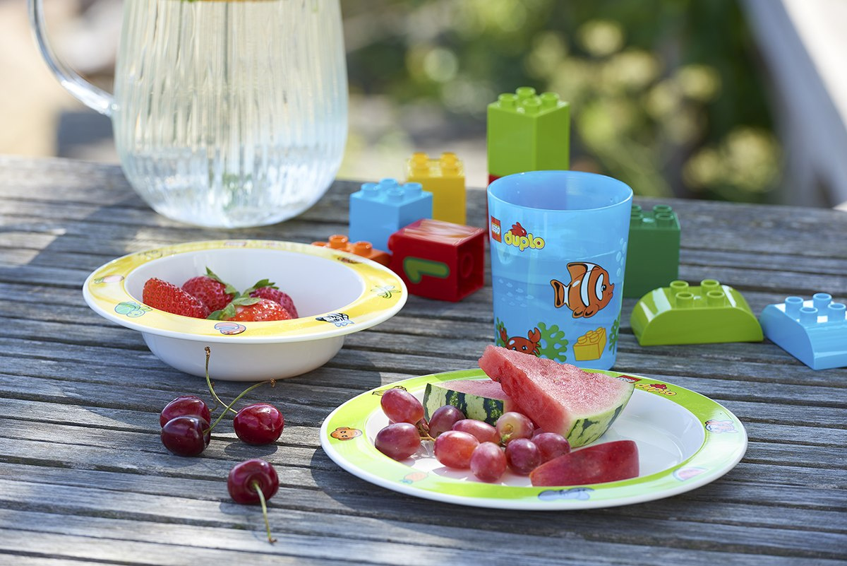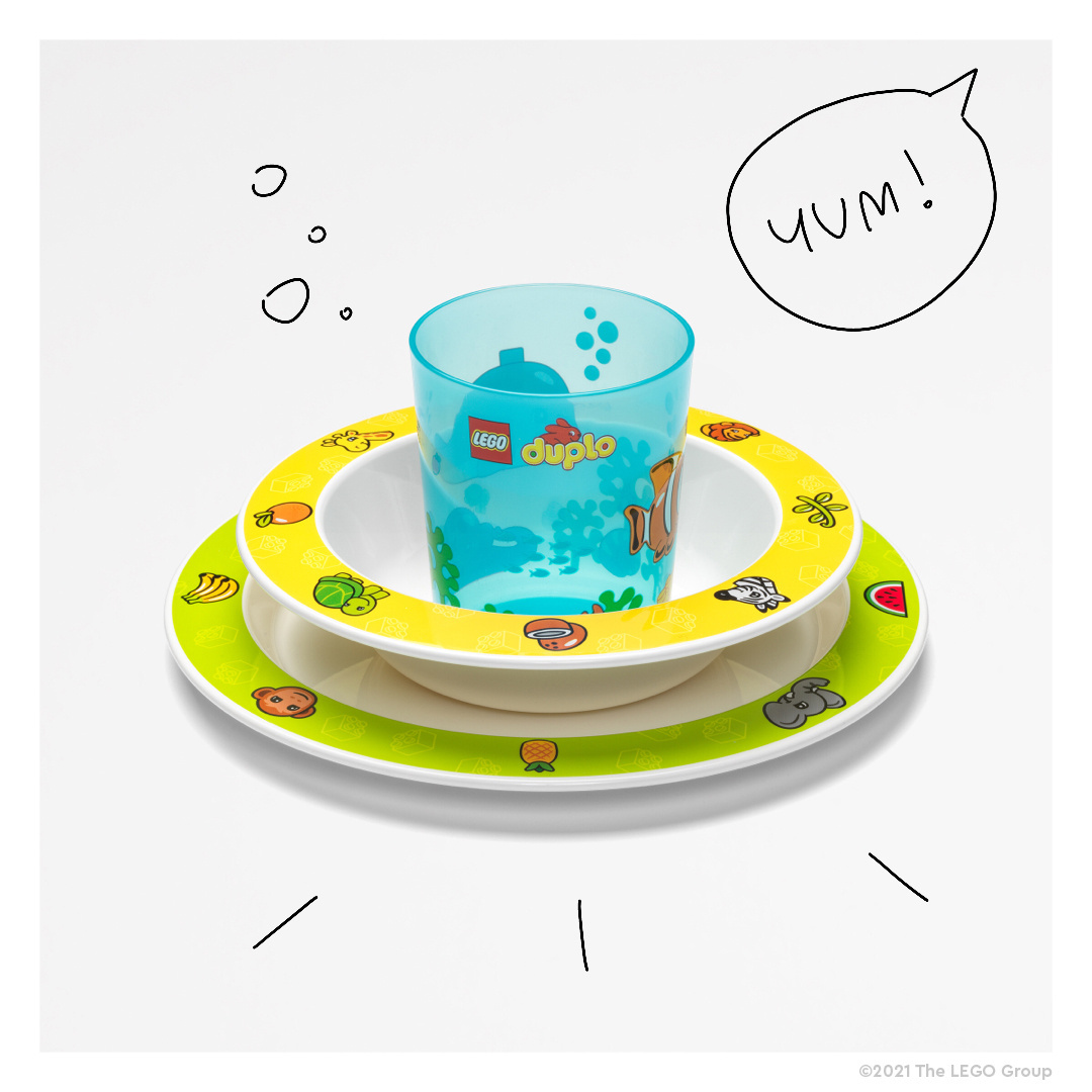 Ten wspaniały kolorowy zestaw naczyń wprowadza najmłodsze dzieci w magiczny świat LEGO® Duplo®. Dzięki nadrukowanym na zastawie owocom i zwierzątkom, które dzieci rozpoznają ze swoich ulubionych klocków, stawianie pierwszych kroków w samodzielnym spożywaniu posiłków staje się radosną przygodą. Zestaw naczyń LEGO® Duplo® jest praktyczny, lekki i nadaje się do mycia w zmywarce. I co najważniejsze jest całkowicie bezpieczny dla Twojego dziecka – nie zawiera BPA, ftalanów ani PCW.