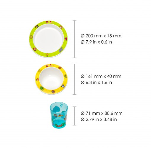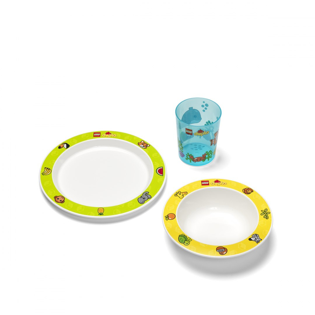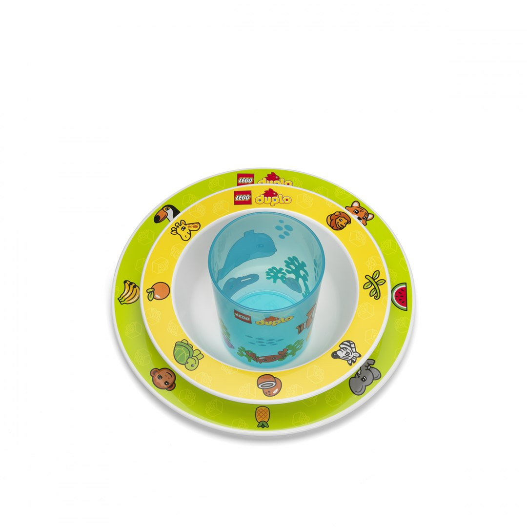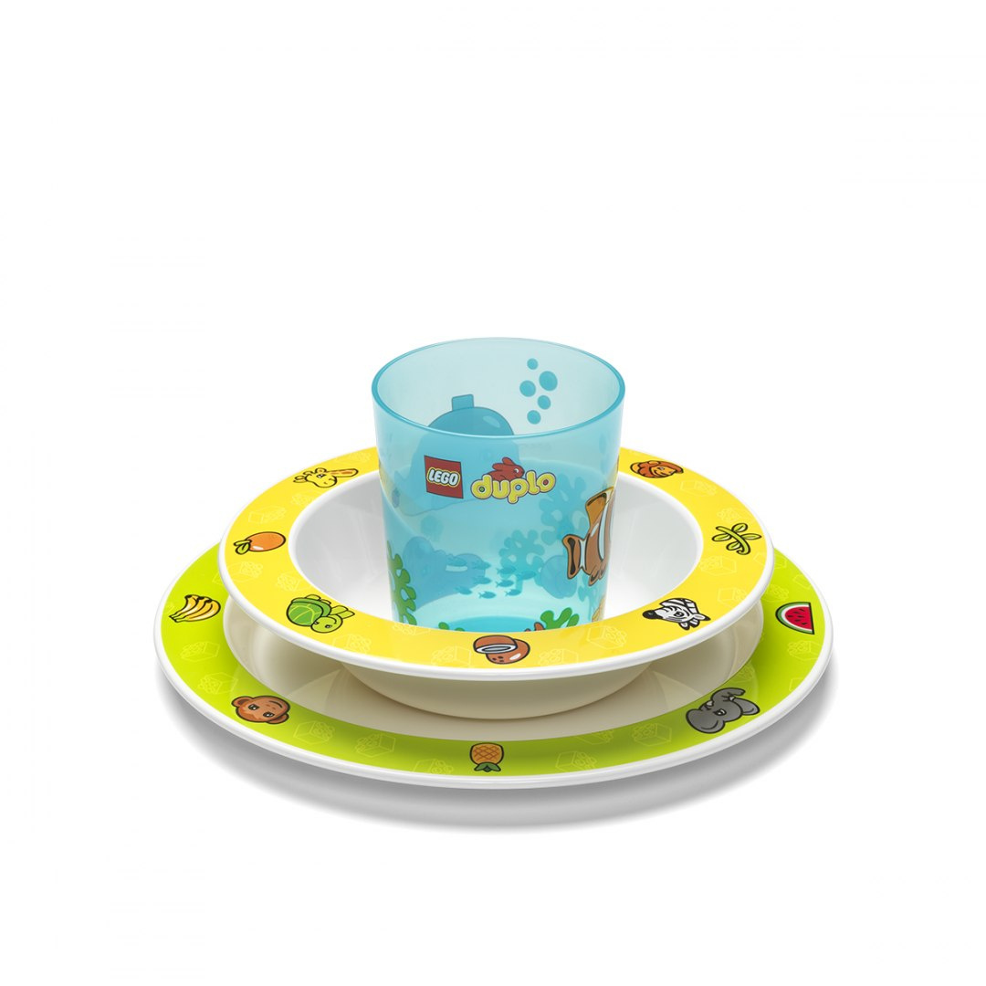 Ten wspaniały kolorowy zestaw naczyń wprowadza najmłodsze dzieci w magiczny świat LEGO® Duplo®. Dzięki nadrukowanym na zastawie owocom i zwierzątkom, które dzieci rozpoznają ze swoich ulubionych klocków, stawianie pierwszych kroków w samodzielnym spożywaniu posiłków staje się radosną przygodą. Zestaw naczyń LEGO® Duplo® jest praktyczny, lekki i nadaje się do mycia w zmywarce. I co najważniejsze jest całkowicie bezpieczny dla Twojego dziecka – nie zawiera BPA, ftalanów ani PCW.